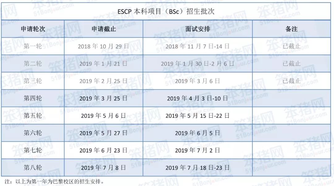 以上是ESCP本科项目(巴黎校区为第一年)的招生批次,2019年秋季入学一共有8个批次,前六轮申请已经截止,目前是第七轮的招生批次。需要注意的是,我们不建议同学们走最后一批,因为最后一批时间非常晚,即使是学校给了录取,在国内也很可能来不及办理签证。