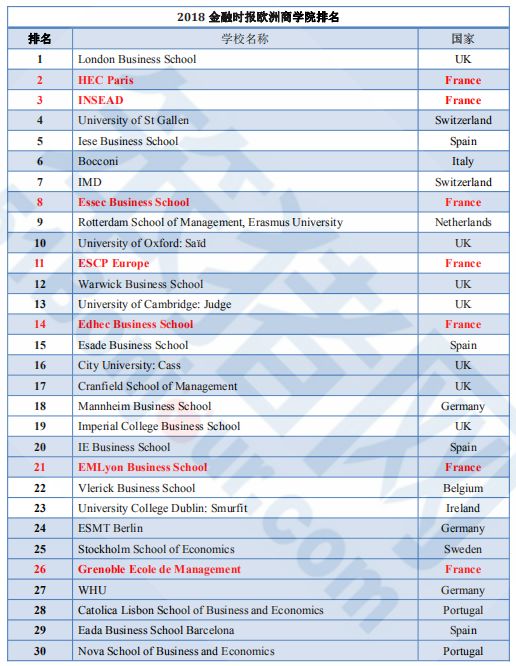 法国名牌商校的学生筛选标准严格,薪酬高,适应企业环境能力强,擅长外语,在就业市场上非常抢手。英国《金融时报》(Financial Times)每年的欧洲顶级商学院排行榜也证明了这一点。法国高商系统的教学质量和招生标准在这个排行榜上得到充分彰显。