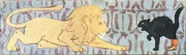 猫看到一头狮子忽然出现在他的面前,吓得要命,连忙跳上了屋檐。因为穿着靴子,他跳起来既吃力又危险,在瓦楞上走路也很不方便。