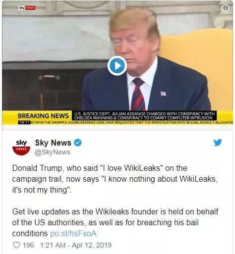 阿桑奇被捕了,维基解密曾经的“迷弟”川普就忽然改了腔调。