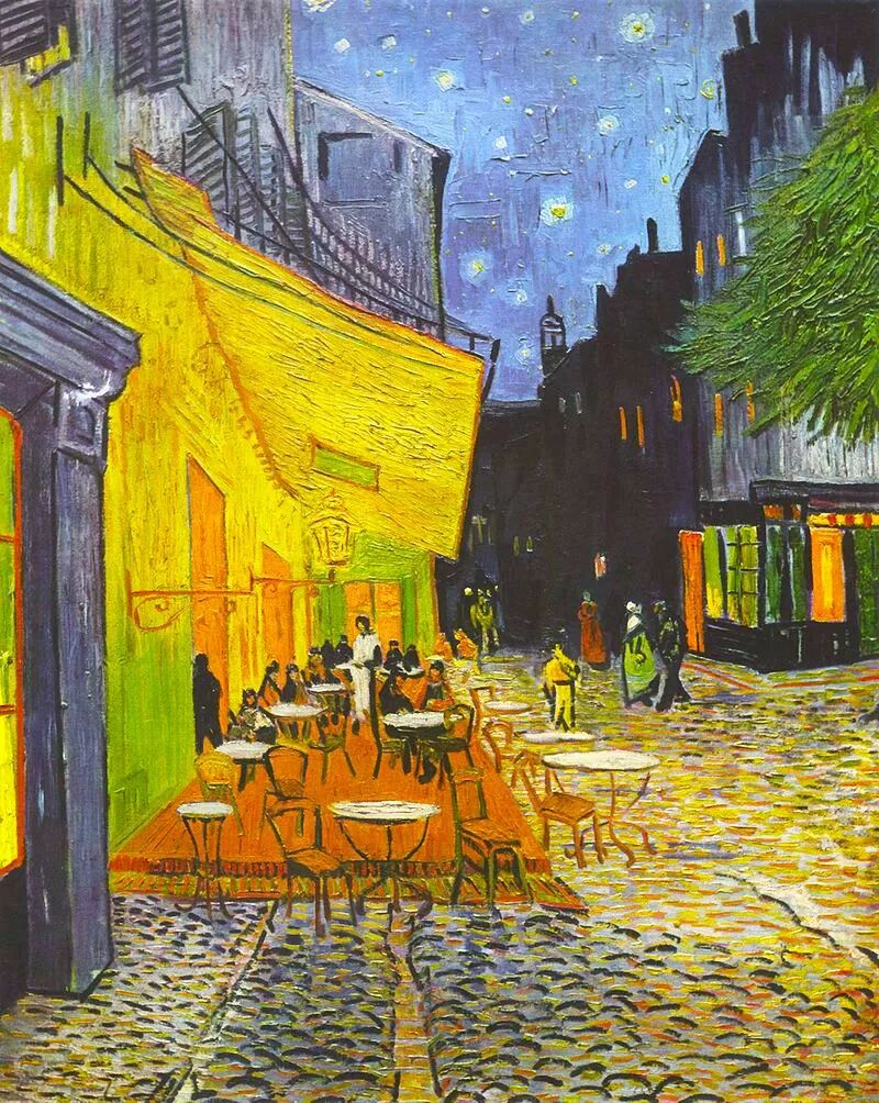 阿尔勒的一家咖啡馆,夜色深沉,黄色煤油灯照射下,人们仿佛都化成了模模糊糊的影子,昏黄,温暖,让人感觉到前所未有的安稳与宁静。