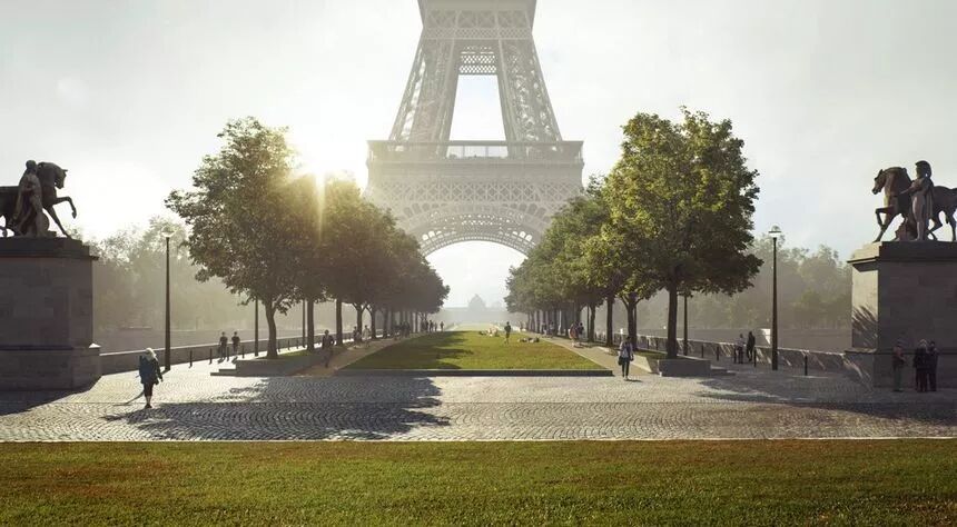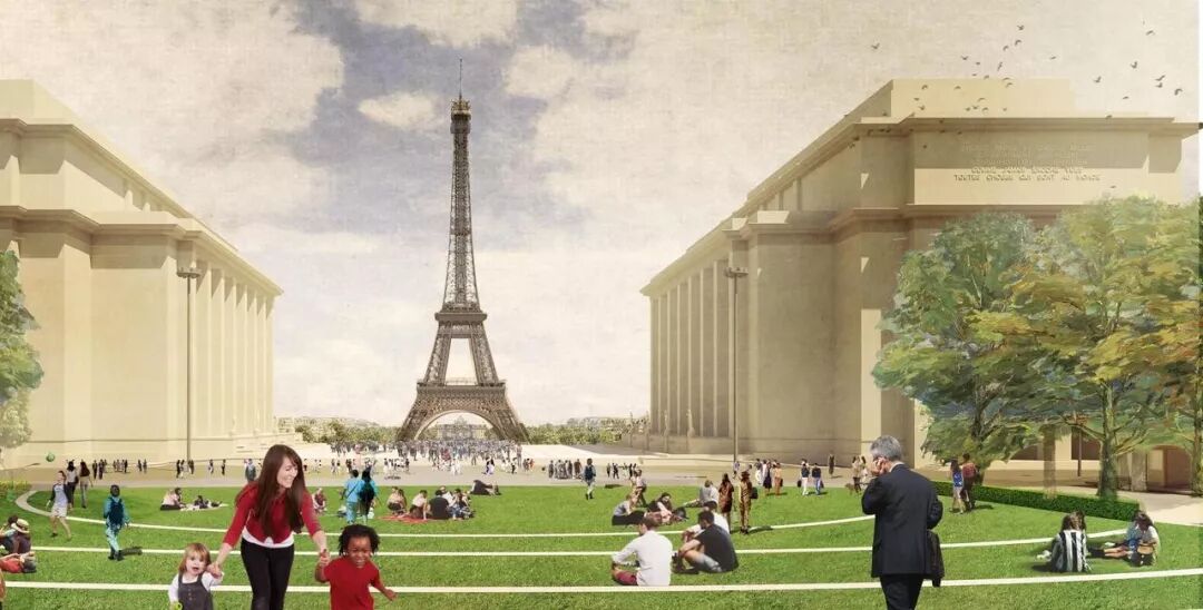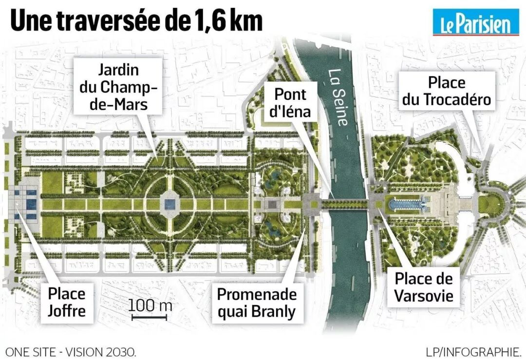 根据目前公布的方案,埃菲尔铁塔和特罗卡德罗广场(La Place du Trocadéro)之间将出现一个占地近50公顷,长1.6公里的巨大花园,只供行人、一些公共交通和紧急车辆通过,大部分汽车不能通行。
