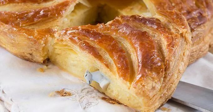 每年1月6日前后都会在超市或者面包店发现它的身影。这种杏仁味浓厚的饼通常由千层酥皮里加奶油杏仁、黄油、鸡蛋和糖制成。