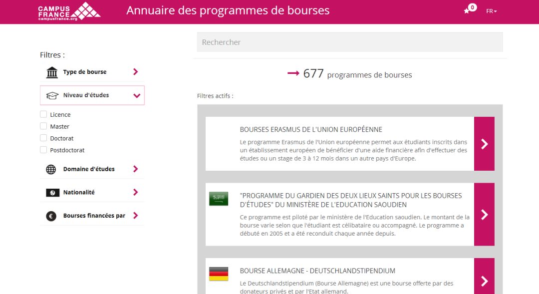 CampusBourses 能够快速提供资助方面的信息并且可以查找适合您个人特质的项目。从学士到博士后,奖学金名录介绍了政府机构项目、地方行政区域项目、企业项目、基金项目和高等教育院校项目。