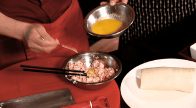 准备半斤碎肉,往里加入一勺料酒、6克盐、半勺生抽、一点生姜末儿。搅拌均匀后放半只鸡蛋液、20克水。最后放葱,才有香味。D'abord, on ajoute une cuillerée de vin de cuisine, puis 6 grammes de sel pour 500 grammes de farce, puis une demi-cuillerée de sauce de soja et un peu de gingembre haché. Après les avoir mélangés, on ajoute une moitié d'œuf battu et 20 grammes d'eau à la farce. Enfin, n'oubliez pas les poireaux hachés.
