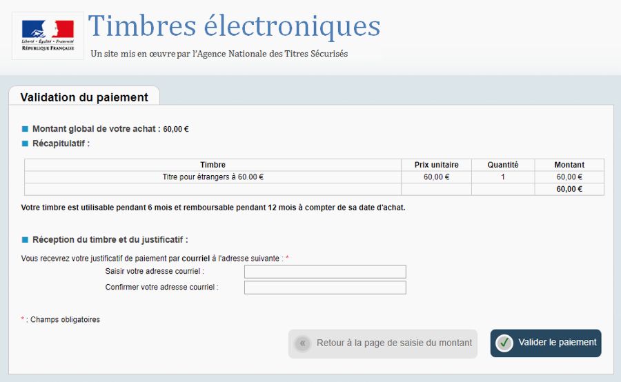 出现上述页面后,正确填写你的个人邮箱地址并再次确认填写邮箱地址,即可确认付款。付款方式分别有:VISA,MASTER,CB,付款时更建议大家使用已经办理成功的法国银行卡。付款成功后,证明材料会直接发送到你刚刚输入的电子邮箱内,注意确认邮件并下载保存好电子版的证明材料哦。