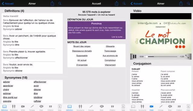 这个词典可以查单词,同义词,法语习语,动词变位,名人语录,历史知识,还有视频讲解。真是的好用到爆,小编建议使用iPhone的同学一定下载一个哦,这是ios的福利啦!
