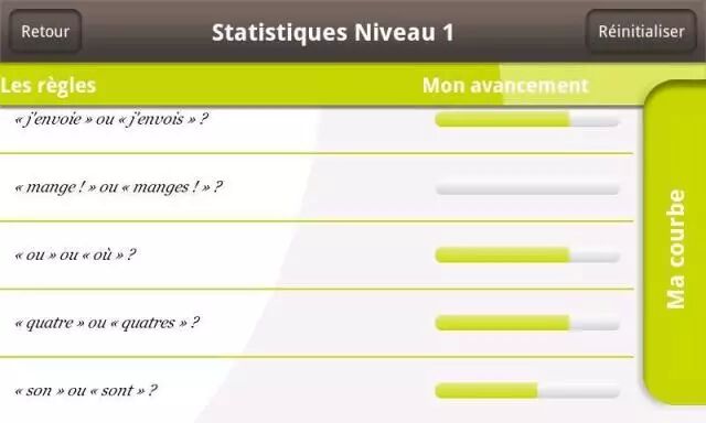 这个app可以检查拼写和语法错误。根据你的知识漏洞和学习节奏,每个等级设有14个不同的难度。可以在statistiques里面查看自己每个等级的学习进度。强烈推荐使用。