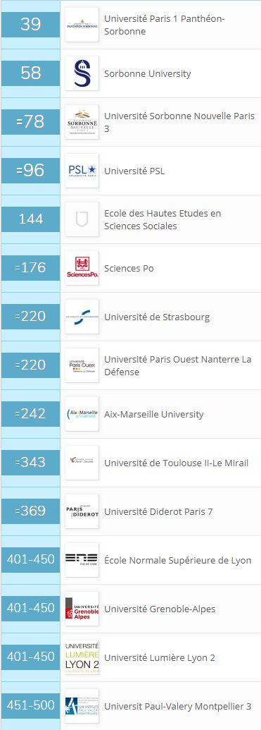 第51-100名:法国社会科学高等研究院(EHESS) 、巴黎文理研究大学(PSL)、索邦大学、巴黎一大、巴黎十大