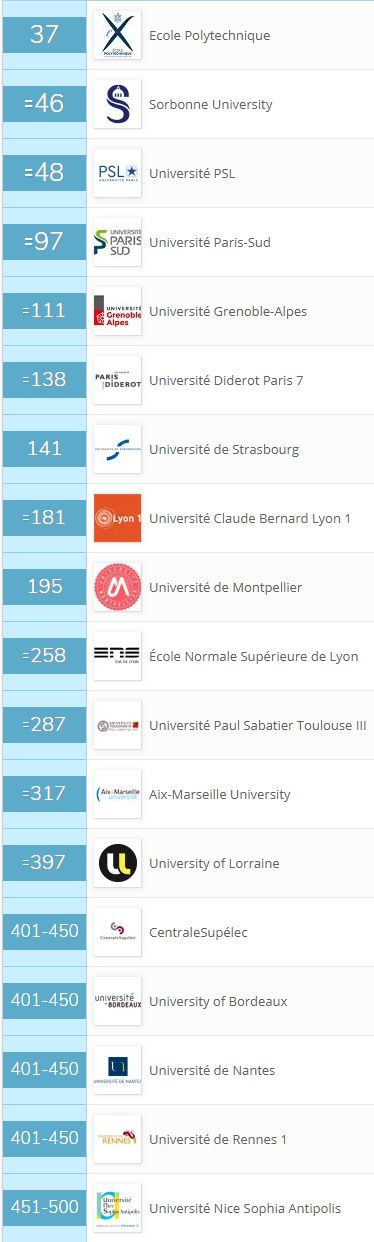 第401-450名:洛林大学、雷恩一大、贡比涅技术大学(UTC)、巴黎一大、图卢兹三大