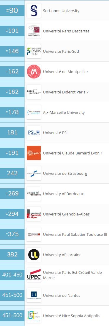 第101-150名:蒙彼利埃大学、斯特拉斯堡大学、巴黎五大