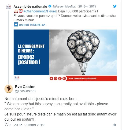 “说好的到半夜才关闭问卷调查,现在就来个‘对不起啊现在页面出错了,请稍后再来’。我支持夏令时间,这样才能在上班之余有足够时间出去浪!”